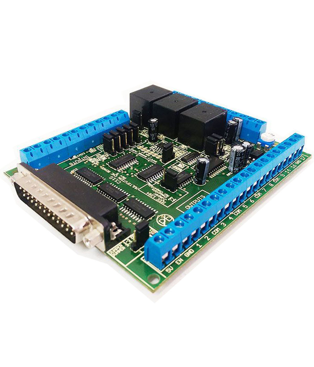 This card has been designed to provide a flexible interface and functions to your computer projects by using the parallel port or USB-based or Ethernet-based controller. This board comes as a response to many customers that have been asking for a faster way to connect devices and reduce the possibility of wiring errors.